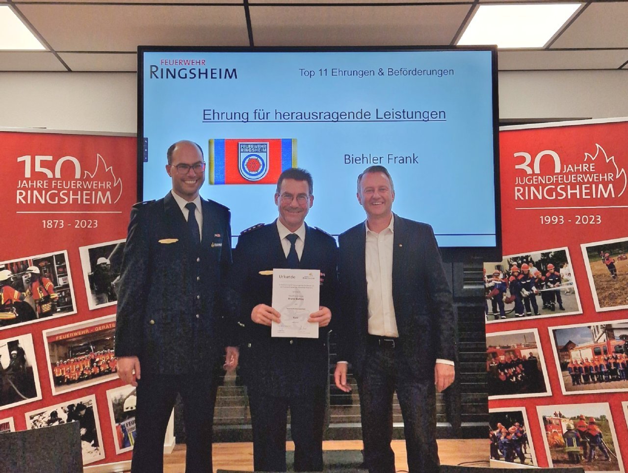In der vergangenen Jahreshauptversammlung der Ringsheimer Feuerwehr erhielt Frank Biehler aus der Hand von Bürgermeister Pascal Weber das neue „Feuerwehr-Ehrenzeichen der Gemeinde Ringsheim“ in Gold. Er ist der erste Feuerwehrmann, der diese Auszeichnung erhält.