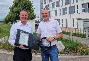 Nun wurde im allerletzten Abschnitt, dem Gewerbe- und Tourismusgebiet „Leimenfeld II“ die letzte LED-Leuchte montiert. Kommunalberater Daniel Kalt von der NetzeBW und Bürgermeister Pascal Weber waren dabei mit vor Ort.