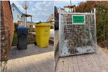 Neben der Urnenwand gibt es nun einen Durchgang in Richtung des Parkplatzes. Auf diesem kleinen Areal befinden sich drei Behälter: ein Behälter für Kunststoffverpackungen, ein Behälter für Restmüll sowie ein Korb für Pflanzenabfälle.